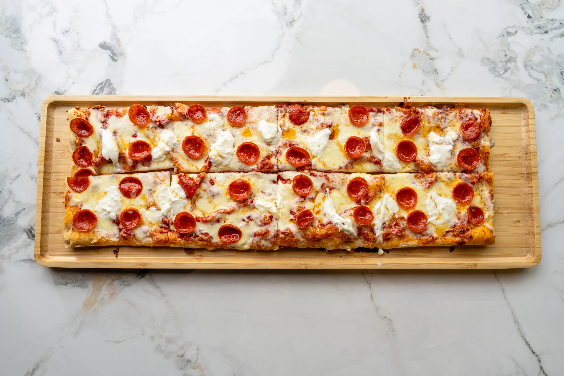 Tomato Sauce, Mozzarella Cheese, Cup-N-Char Pepperoni, Burrata Cheese, Hot