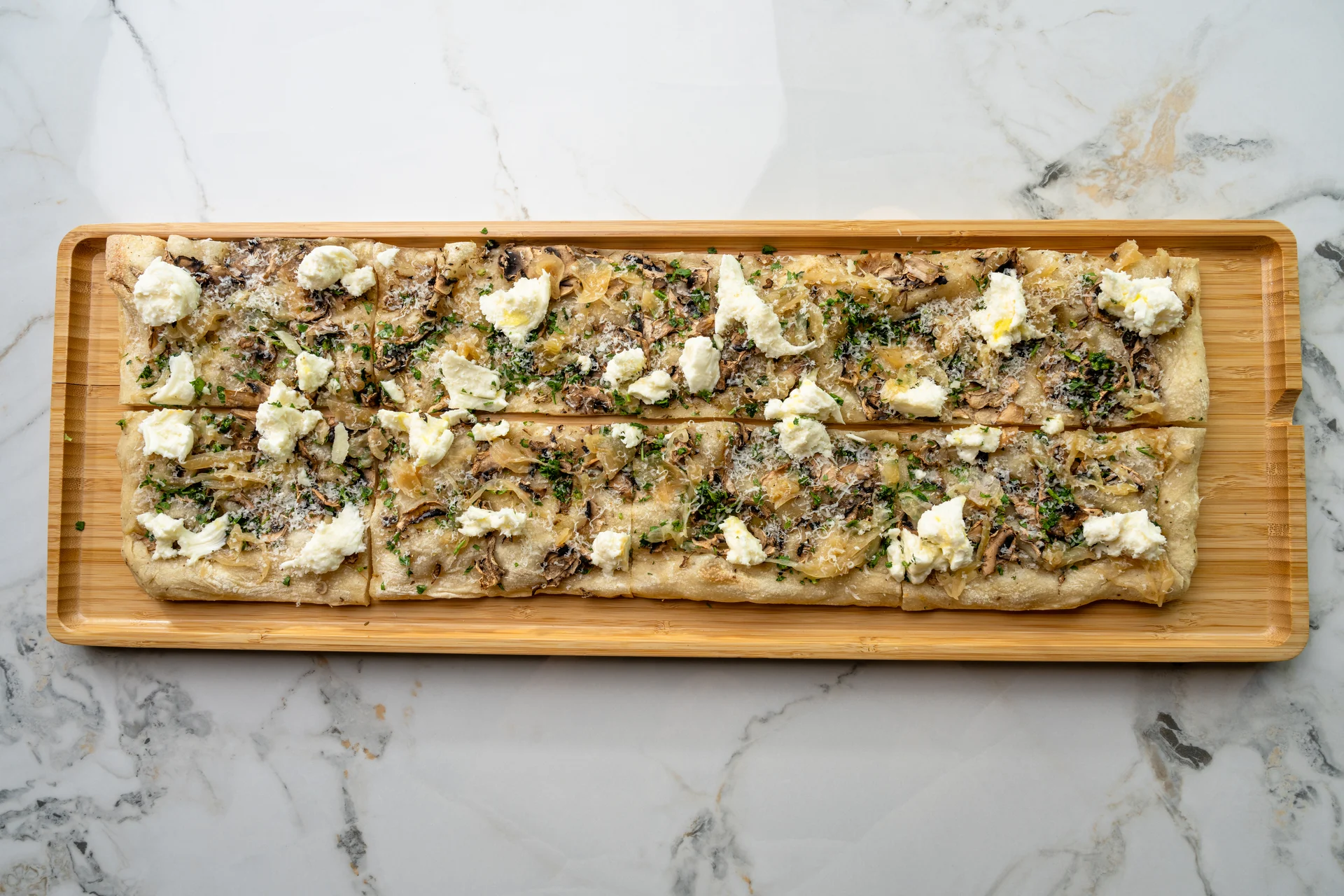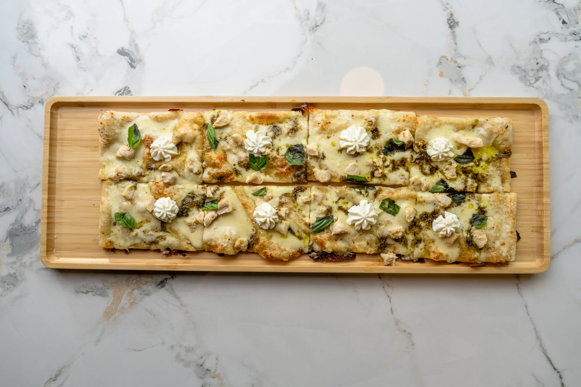 Signture four cheese: Shredded Mozzarella, Mozzarella Fior Di Latte, Ricotta, and Straciatella topped off with fresh basil