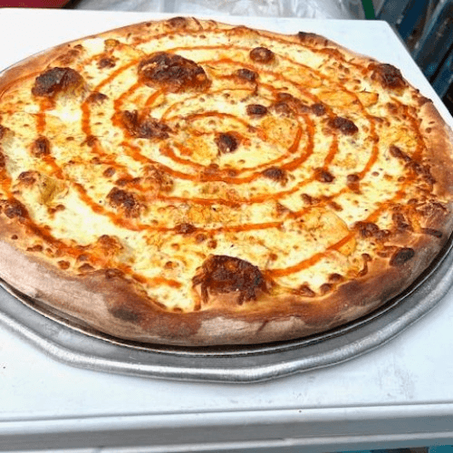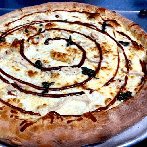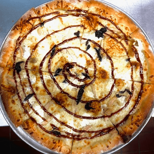 Four Cheese pizza, freshly roasted chicken breast, BBQ sauce, topped with drizzle of ricotta cream.