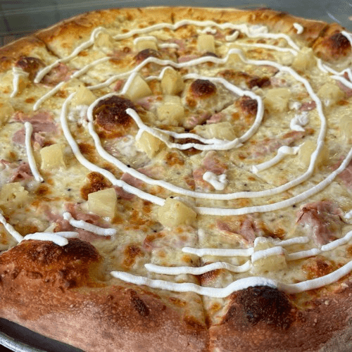 Made with shredded mozzarella, provolone, grated parmigiano, smoked Viriginia ham, pineapple chunks, topped with ricotta cream
