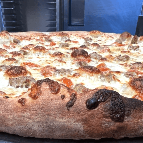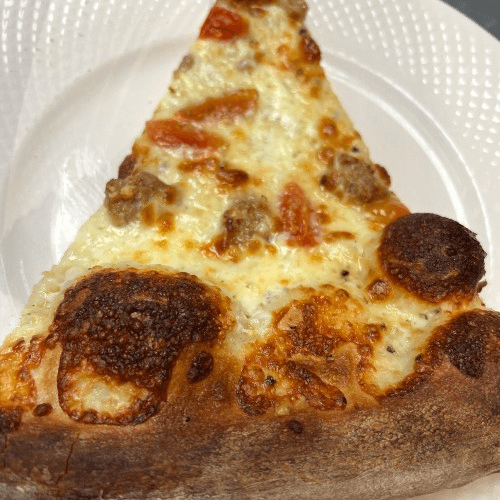 Four cheese pizza, sausage, cracked pepper, fresh tomatoes