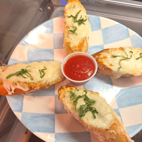 4 slices of homemade garlic bread topped with butter, shredded mozzarella/parmigiano, parsley and side of house tomato sauce