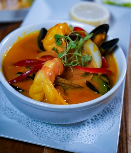 Spanish style, seafood stew of scallops, shrimp, fresh salmon, squid, and clams cooked with saffron. Served with white rice on the side.