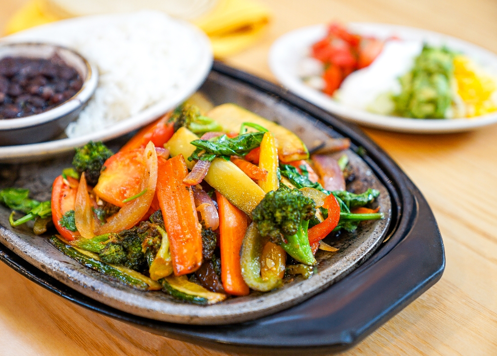 Combination of zucchini, mushrooms, tomatoes, broccoli, and refried beans on a sizzling platter over a bed of sautéed green peppers and spanish onions. Served with mexican rice, guacamole, lettuce, pico de gallo, sour cream, mexican butter, and homemade tortillas on the side.