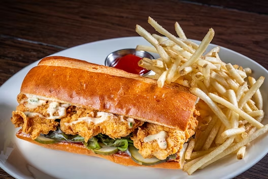 remoulade sauce on a brioche bun & fries.